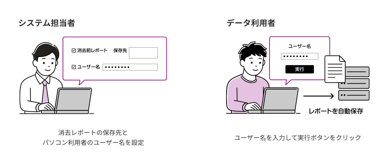 システム担当者が1台1台データ消去するのではなく、パソコン利用者自身で消去した際にレポートを残す設定ができます。シンプルな操作画面でわかりやすく、消去レポートも指定したフォルダに自動アップロード。専門知識がなくても安全に運用できます。